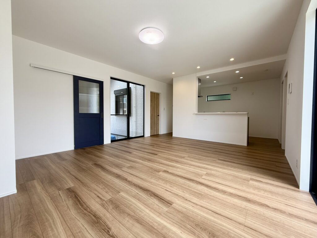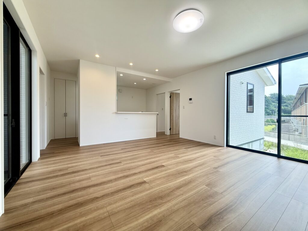 白を基調とした内装に、温かみのある木目フローリングが映えるナチュラルな空間です。