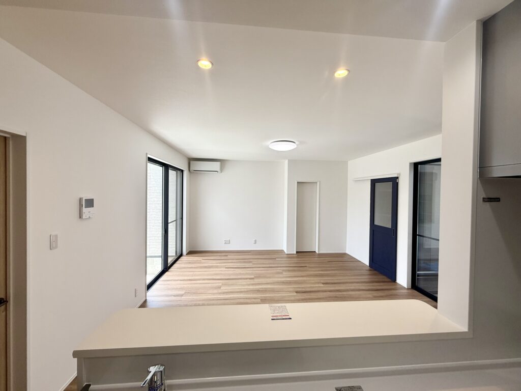 キッチンからリビング全体を見渡せる配置で、料理をしながら家族との会話も自然に生まれます。