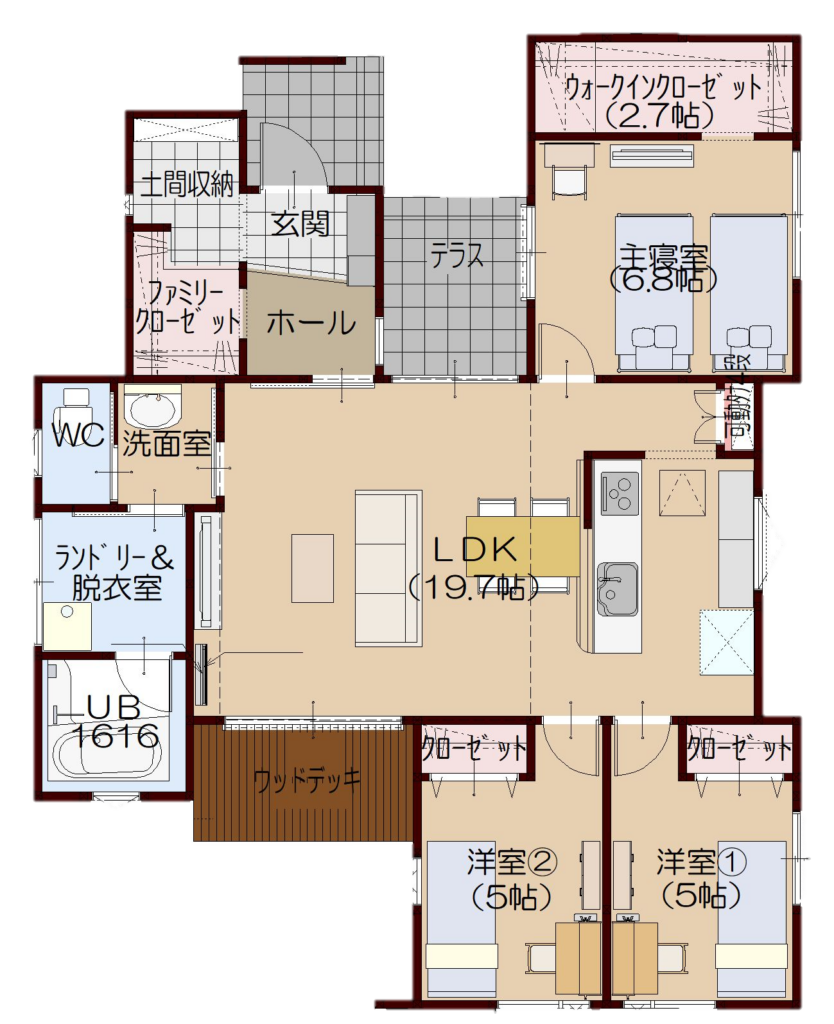 19.7帖のゆとりあるLDKを中心に、各居室へスムーズにつながる家族動線を実現しました。